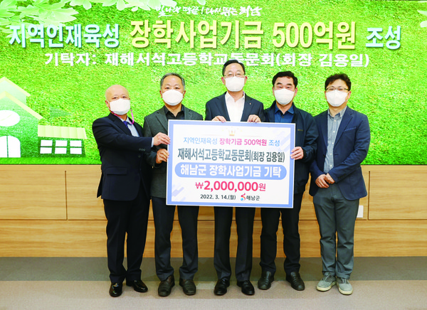 재해 서석고등학교동문회(회장 김용일)가 해남군 장학사업기금에 200만원을 기탁했다.