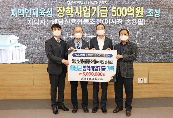 해남신용협동조합(이사장 송용필)이 지역의 인재양성과 교육발전을 위해 해남군 장학사업기금으로 500만원을 기탁했다. 기탁식은 지난 11일 해남군청 군수실에서 명현관 군수, 송용필 이사장, 이병채 부이사장, 김성학 상무 등 관계자들이 참석한 가운데 진행됐다.