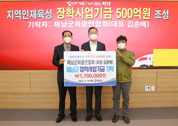 해남군화물연합회(회장 김춘배)가 해남군 장학사업기금으로 170만원을 기탁했다.