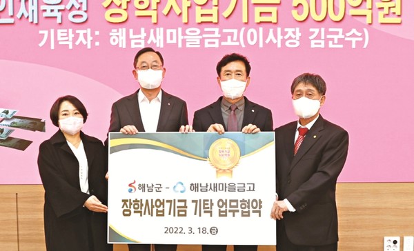협약에 따라 해남새마을금고는 수익 일부를 매년 해남군 장학사업기금으로 기탁하고 군은 해남새마을금고의 이미지마케팅을 위한 홍보에 적극 협력해 나가기로 했다.