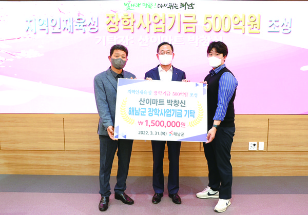 산이마트 박창신씨가 해남군 장학사업 기금에 150만원을 기탁했다.