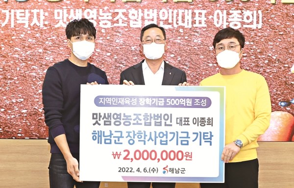 맛샘 영농조합법인 이종희 대표가 지난 6일 해남군장학사업기금에 200만원을 보탰다. 산이면 신농리에 소재하는 맛샘영농조합법인을 운영하고 있는 이종희 대표는 호박자색꿀고구마, 고구마말랭이, 아이스군고구마 등 가공식품을 판매하며 연 38억원의 매출을 자랑하는 경영자이다. 기탁식은 동생 이정희씨과 함께했다. 이종희 대표는 “해남군의 교육발전을 위한 장학사업기금에 기탁할 수 있어 뜻깊게 생각한다. 앞으로도 항상 관심을 가지고 응원하겠다”고 말했다.