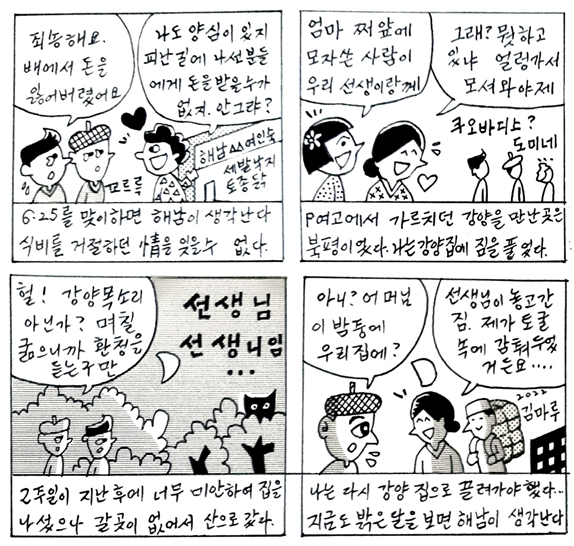 일행이 북평면에 이르렀을 때는 믿을 수 없는 일이 있었다. 우연히 P여고 제자 강남순 양을 마주친 것이다. 강양은 뛸듯이 기뻐했다. 일행은 강양의 집에서 2주일을 머문뒤에 길을 나섰다.