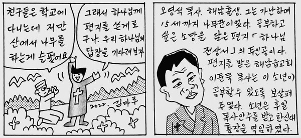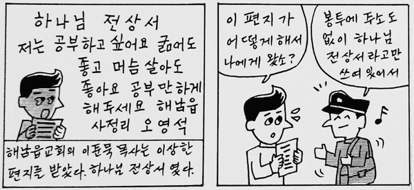 하나님께 편지를 쓰면 어떻게 될까? 간절한 소원을 담아서 편지를 쓰면 하나님은 읽어보실까? 주소는 어디로 써야 할까? 조금 엉뚱한 이야기다. 그런데 실제로 하나님 앞으로 편지를 쓴 사람이 있었다. 집안이 너무 가난해서 초등학교를 나온 뒤로 중학교에 진학하지 못한채 나무하러 다니던 해남읍 오영석 소년의 이야기다.