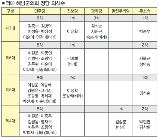 민주당이 9석을 차지하면서 제8대 해남군의회 상반기 원구성도 민주당 일색으로 꾸려질 가능성이 높게 됐다.