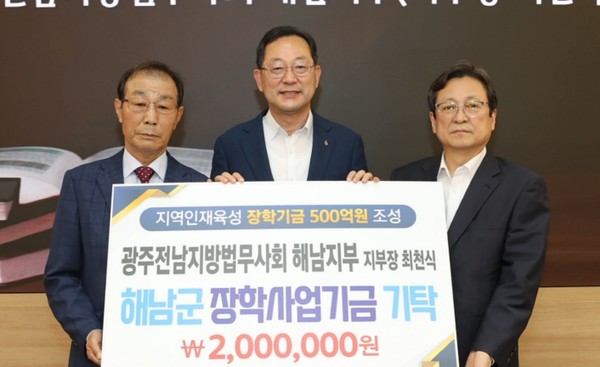 광주전남지방법무사회 해남지부(지부장 최천식)에서 해남군 장학사업기금에 200만원을 기탁했다.
