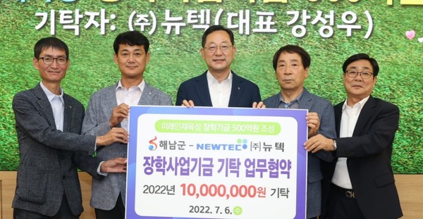 해남군과 ㈜뉴텍(대표 강성우)는 지난 6일 인재육성과 지역발전을 위한 장학사업기금 기탁 업무협약을 체결했다. 협약에 따라 뉴텍은 올해 1,000만원을 시작으로 매년 수익 일부를 기탁하게 된다.