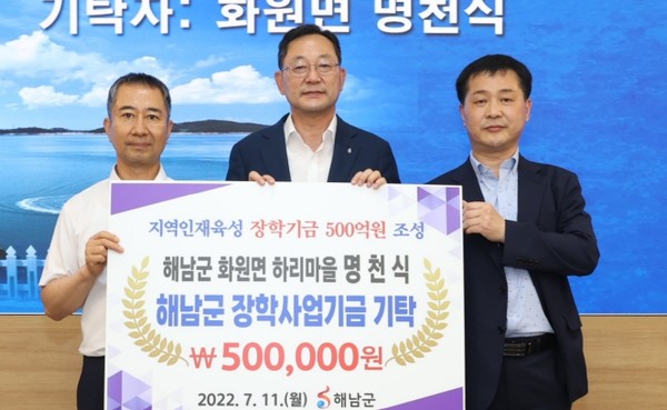 화원면 하리 명천식씨가 장학사업기금에 50만원을 기탁, 해남군 장학사업기금 500억원 조성에 동참했다.