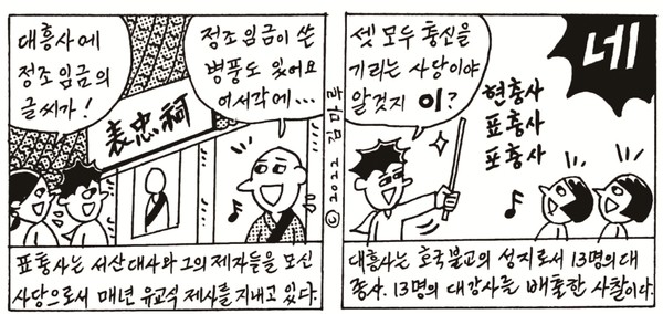 대흥사 표충사는 불교식 건물이 아니다. 영정을 모시고 유교식으로 제사를 지내는 사당이다. 서산대사는 임진왜란이 일어나자 선조를 찾아갔다. 대사는 선조에게 약속했다. “전하. 저는 온 나라의 스님들을 많이 알고 있습니다. 분부만 내리시면 불러모아 왜적과 싸우겠습니다” 서산대사는 약속대로 승병 5,000을 이끌고 왜적과 싸웠다. 그리고 많은 공을 세웠다.