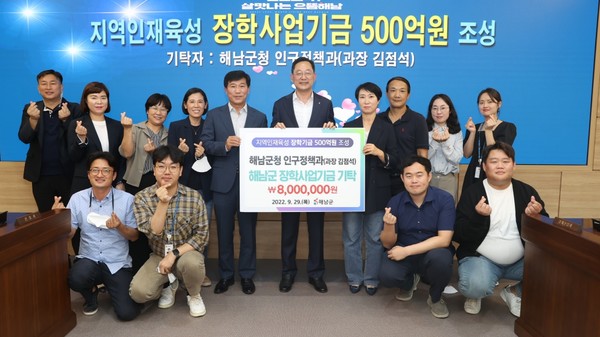 해남군 인구정책과(과장 김점석)가 장학사업기금에 800만원을 기탁했다.
