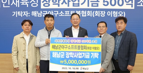 해남군 야구소프트볼협회(협회장 이형오)가 300만원, 여기에 이형오 협회장이 200만원을 더해 총 500만원을 해남군장학사업기금에 기탁했다.