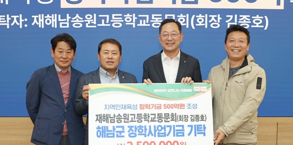 재해남 송원고등학교 동문회(회장 김종호)가 해남군 장학사업기금에 250만원을 기탁했다.
