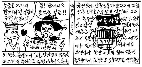 해남 녹우당은 경주 최부자, 구례 운조루와 함께 조선을 대표하는 양반가 부잣집으로 알려져 있다. 수백년 동안 주민들과 함께했던 이들 명문가문에는 전해오는 미담도 많다. 녹우당의 아름다운 문화와 전통은 한국인 모두의 자랑이다.