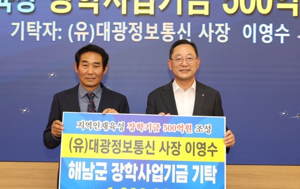 (유)대광정보통신 이영수 사장이 지난 10일 해남군 장학사업기금에 100만원을 기탁했다.