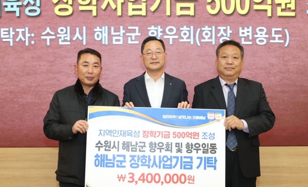 수원시 해남군향우회(회장 변용도)는 회원들의 자비로 모은 장학기금 340만원을 지난 11월29일 해남군에 기탁했다.