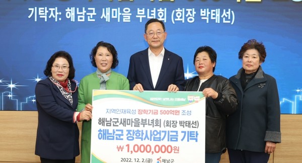 해남군새마을부녀회(회장 박태선)가 지난 2일 해남군 장학사업기금에 100만원을 기탁했다. 이날 기탁금은 회원들이 십시일반 모은 것이다.