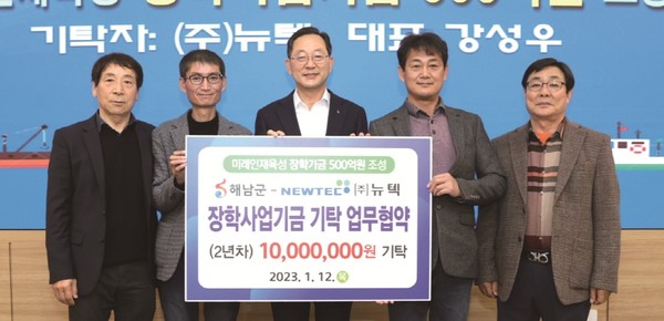 ㈜뉴텍(대표 강성우)이 올해 제1호로 해남군 장학사업기금에 기탁금을 전달했다.