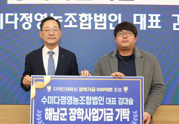 수미다정영농조합법인 김대슬 대표가 지난 1월31일 해남군 장학기금 500억원 조성에 100만원을 보탰다.