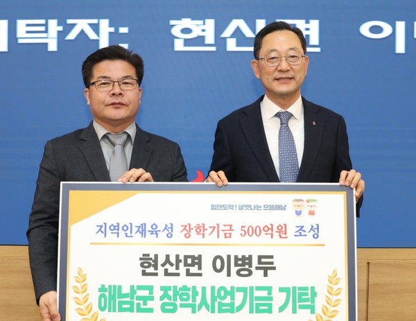 현산면 이병두씨가 500만원을 기탁, 해남군 장학사업기금조성에 동참했다. 기탁식은 지난 1월31일 해남군수실에서 진행됐다.