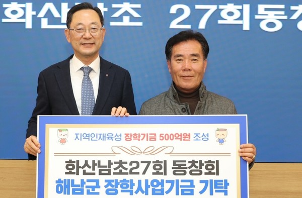 화산남초 27회 동창회(회장 곽종안)도 장학기금 조성운동에 함께했다. 지난 1월31일 해남군수실에서 100만원을 보탰다.