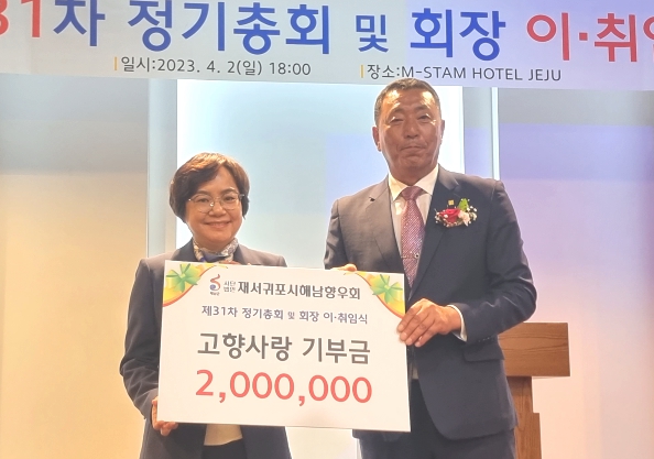 지난 2일 서귀포시 M스테이 호텔에서 재서귀포 해남향우회 이‧취임식이 개최된 가운데 장은술 이임회장이 고향해남에 고향사랑기부금 200만원을 기부했다.