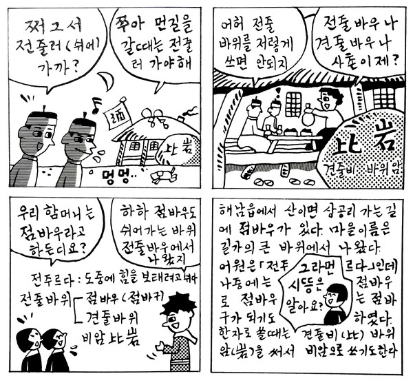 ‘전주르다’는 먼 길을 갈 때 힘을 아끼기 위해 중간에 쉬어가는 것을 가리키는 우리 말이다. 그러니까 금송리의 ‘전줄바위’는 ‘전줄러가는 바위’ 즉, 쉬어가는 바위였던 것이다. 점바우, 점바구는 그 후의 변화로 보인다.