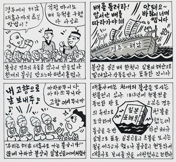 해남 대흥사에는 천개의 불상을 모신 전각, 천불전이 있다. 현재의 천불전 건물을 지은 이는 초의선사 스승인 완호대사다. 1813년(순조13)에 천불전을 중건한 대사는 질이 좋기로 소문난 경주의 옥석(玉石)으로 천불을 조각하게 했다. 열 명의 장인들이 천불을 완성하기까지는 6년이 걸렸다. 경주 기림사에서 완성된 천불을 나눠 실은 두 척의 배는 1817년 11월 18일 경주 장진포를 출발해 해남으로 향한다. 그러나 도중에 풍랑을 만나 파도에 떠밀리는 운명을 맞는다. 232위를 실은 배는 무사히 해남으로 떠났지만 768위를 실은 배는 일본 나가사키의 해변에 닿는다. 여기까지는 기록이 전하는 역사다. 불상과 함께 일본으로 표류한 배에 타고 있던 풍계현정(楓溪賢正) 스님이 남긴 <일본표해록>에 나오는 내용이다.