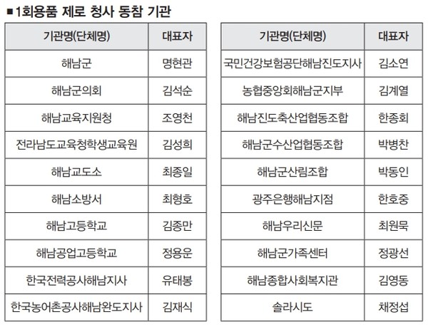이와 관련 오는 12일 해남군청 대회의실에서 공공기관 및 유관기관 1회용품 제로 청사 운영 협약식이 진행된다. 협약식에는 공공기관 11개소, 유관기관 5개소, 기타 4개소가 참여한다.