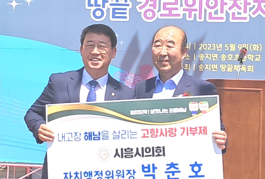 시흥시의회 박춘호 자치행정위원장이 고향사랑기부제에 150만원을 기탁했다. 기탁식은 송지면 송호마을에서 개최된 17회 땅끝체육대회에서 진행됐다.