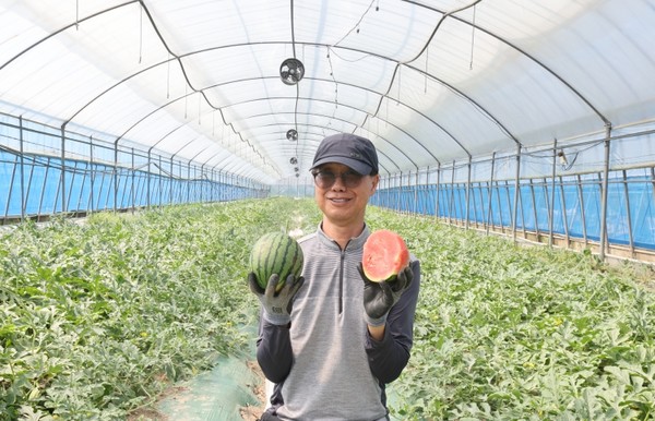 옥천면 화촌리 서명기(57) 농부는 지난달 30일부터 2,500평 하우스에서 애플수박을 본격 출하하고 있다.