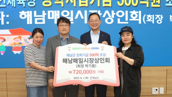 해남매일시장 상인회(회장 박기용)는 올 2월 개장 이벤트로 진행한 경매 행사에서 얻는 수익금 72만원을 장학기금에 기탁했다. 나머지 300여만원은 튀르키예 지진피해 구호금에 전달한 바 있다.