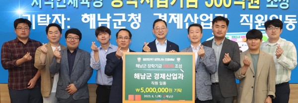 군청 경제산업과는 전남 지역경제 활성화 대상 포상금 500만원, 해남군청 농정과는 친환경농업 및 농산시책 기관표창 포상금 200만원을 기탁하며 장학금 조성에 힘을 보탰다.