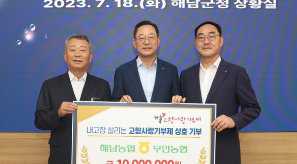 해남농협과 무안농협은 각 조합 임직원 100명의 뜻을 모아 마련한 기부금 1,000만원씩을 상호 지역에 기부했다.