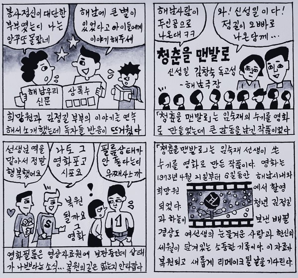 한편, 영화를 리메이크하거나 연극무대에 올리는 방법도 있다. 50년 전에 ‘청춘을 맨발로’라는 영화를 탄생시킨 부부가 해남에 살았고, 그 무대가 해남이었다는 사실을 우리의 후손들에게 알려야 한다.
