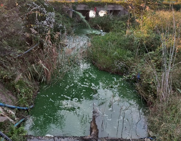 인근 주민에 의하면 “지상과 지하에서 연결된 호스를 타고 폐수가 방류되는데. 특히 오전 시간이면 엄청난 양의 녹조 물이 쏟아진다”고 말했다.