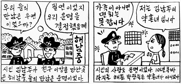 “바른 일을 하고서도 갇혀있는 김남주 선생님을 옥바라지해주고 싶었어요. 가족이 아니면 면회가 안 된다길래 약혼녀가 되기로 했지요.”
