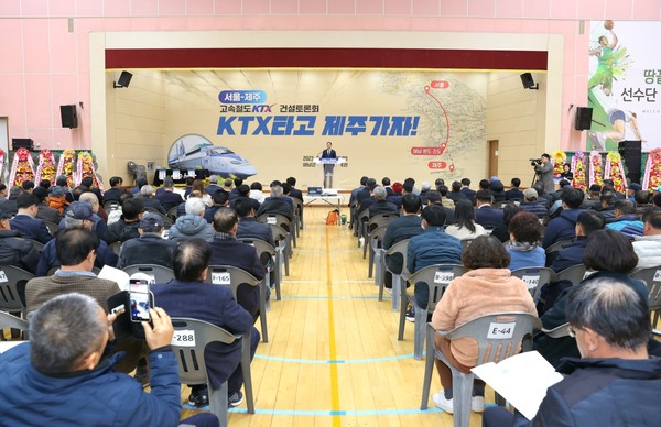 ‘KTX 타고 제주 가자’ 고속철도 건설 토론회가 지난 11월17일 해남군 우슬동백체육관에서 열린 가운데 KTX 제주 고속철이 국토균형발전 차원에서 해남과 완도를 비롯한 전남 시군을 경유해야 한다는 주장이 제기됐다.
