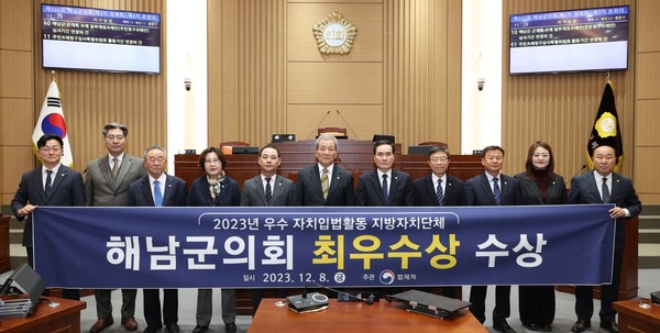 해남군의회(의장 김석순)는 지난 12월8일 한국광고문화회관에서 열린 2023년 우수 자치입법 활동 기초지방자치단체 부문에서 최고상인 최우수상과 포상금 200만원을 받았다. 민홍일 의원이 대표 발의한 「해남군 공공자금 운용 및 관리 조례」가 최우수 조례로 인정받은 것이다. 광역부분에선 「경기도 중대재해 예방 및 관리에 관한 조례」를 제정한 경기도가 최우수상을 받았다.