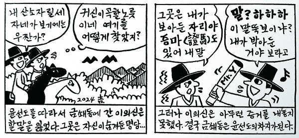 며칠 뒤 고산이 의신을 찾았다. “내가 묻힐 명당 터를 보아두었는디 나랑 같이 가볼랑가?” 의신은 고산을 따라나섰다. 금쇄동에 이르렀을 때 의신의 눈에 호롱불이 켜졌다. 터가 어떠냐고 고산이 물어도 의신은 먼 산만 바라볼 뿐이었다. 고산이 흙이 묻은 말뚝을 꺼내왔을 때에야 의신이 입을 열었다. “실은 이 자리는 내가 전부터 보아 둔 곳이네. 그렇지만 할 수 없지. 땅 임자는 따로 있었어…”하면서 하하하, 크게 웃었다.