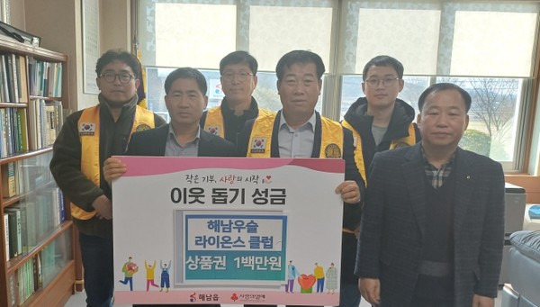 해남 우슬라이온스클럽은 지난 1월29일 해남읍사무소를 방문해 100만원 상당의 해남사랑상품권을 기부했다.