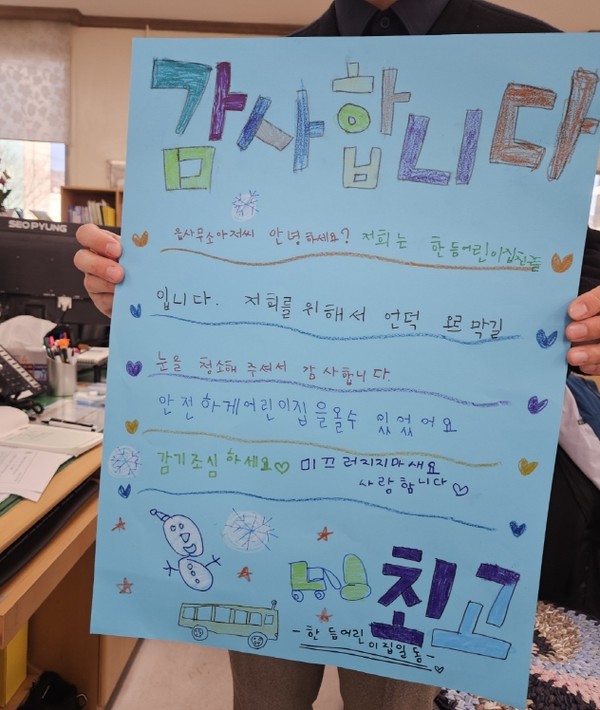 해남읍사무소 직원들이 지난 1월13일 한듬 어린이집 언덕길에 내린 많은 눈을 치우는 제설작업을 실시했다. 이에 한듬어린이집에 다니고 있는 어린이들이 고사리손으로 감사편지를 선물해 직원들 마음을 따뜻하게 해 줬다.