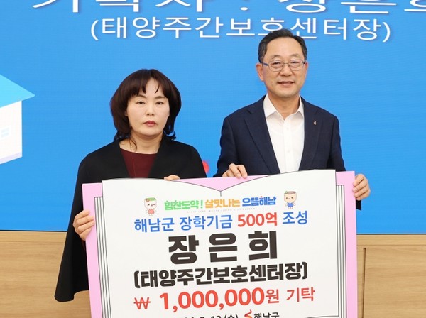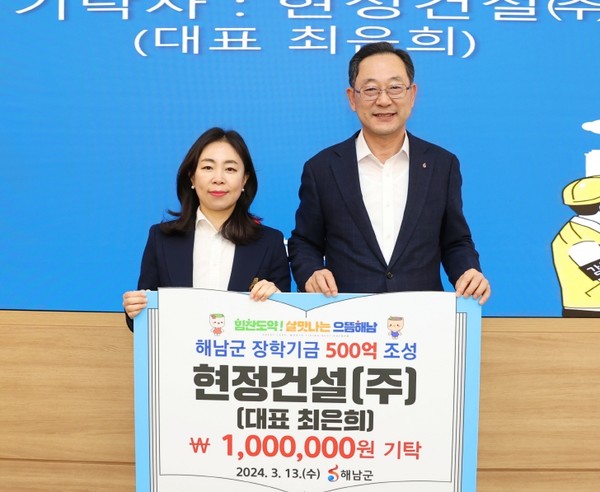 해남읍에서 콘크리트 및 철근사업에 종사중인 최은희 현정건설(주) 대표는 “넉넉한 상황은 아니지만, 미래 인재 육성이라는 좋은 취지에 참여하고 싶었다”고 기탁 동기를 밝혔다.