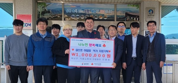 해남군의용소방대 연합회 오영동 회장이 지난 4월1일 삼산초 아이들의 아침밥 먹기 운동에 도움이 됐으면 한다며 해남사랑상품권 100만원을 지정기탁했다.