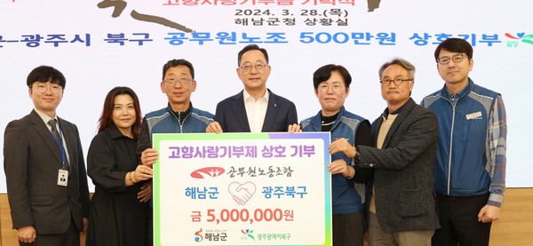 해남군 공무원노조와 광주광역시 북구 공무원노조가 고향사랑기부제 활성화를 위해 각각 고향사랑기부금 500만원을 상호 교차 기부했다.