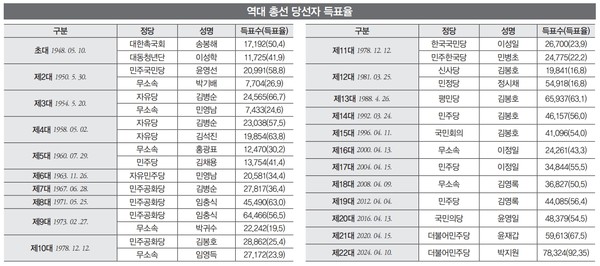 다음은 1954년 자유당 시절 치러진 제3대 총선에서 자유당 김병순 후보가 얻은 66.7%였고 황색바람이 거셌던 1988년 제13대 총선 때 평민당 김봉호 후보가 얻는 63.1%가 뒤를 이었다.