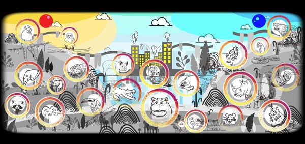 ‘길다란 지구, 픽토그램 정글’은 이조흠 작가의 작품이다. 이 작품은 두 가지 영상으로 구성된 미디어 파사드 작업으로, 바닥과 벽을 ‘지구’와 ‘정글’로 치환한다.