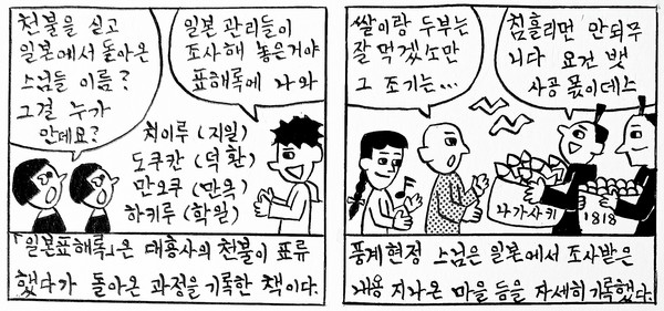 1817년 겨울, 대흥사 스님들이 탄 배가 일본으로 떠내려갔다. 천불을 싣고 오다가 표류한 것이다. 《일본표해록》은 그 배에 타고 있던 풍계현정 스님이 쓴 책이다. 책은 천불을 만들게 된 과정과 일본에서 보낸 8개월을 담고 있다. 일본에 다녀온 대둔사(대흥사) 스님들의 명단도 실려있다.