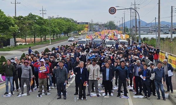 트럭이 고도사거리 한 방향을 가득 메운 가운데 열린 집회에서 농민들은 세계 각국은 재난적인 이상기후로 발생할 농산물 생산 감소를 우려해 특단의 대책을 마련하고 있는데 윤석열 정부는 IMF이후 최악의 경제 상황을 초래하고 있고 또 농산물 수급을 조정할 능력마저도 없다며 마을마다 현수막을 게시하고 집집마다 저항하는 깃발을 게시해 윤 정부의 농정에 반대하는 의사를 표현해 나가겠다고 강조했다.