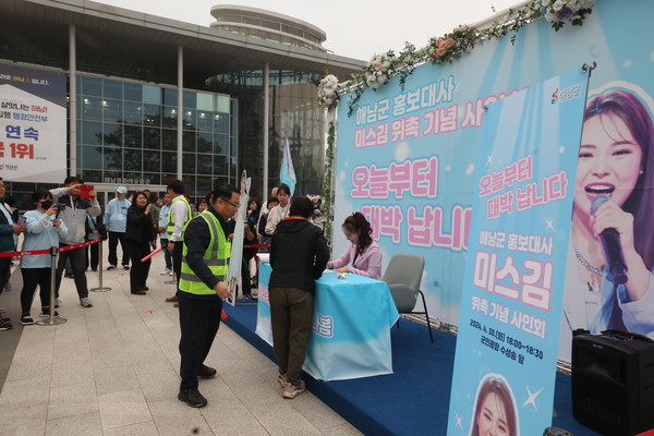지난 4월30일 오후 6시 군민광장 수성송 앞에 긴 줄이 섰다. 이날 전국에서 달려온 미스김 팬클럽 회원들과 미스김을 보기 위해 모인 군민들이 사인회에 참여했다.