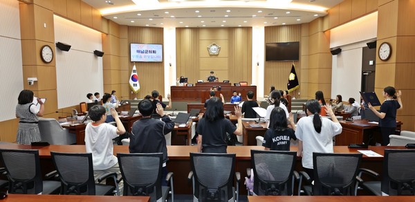 이번 제7회 해남군의회 어린이·청소년 의회체험교실은 의장, 의원, 조례안 발의자, 사무과장, 의사팀장 등 각각의 역할을 맡아 개회 선포, 집회보고, 직접 만든「해남군 골목길 안전에 관한 조례안」을 가지고 제안설명, 토론 및 표결을 해보는 등 실제 본회의와 동일하게 진행됐다.